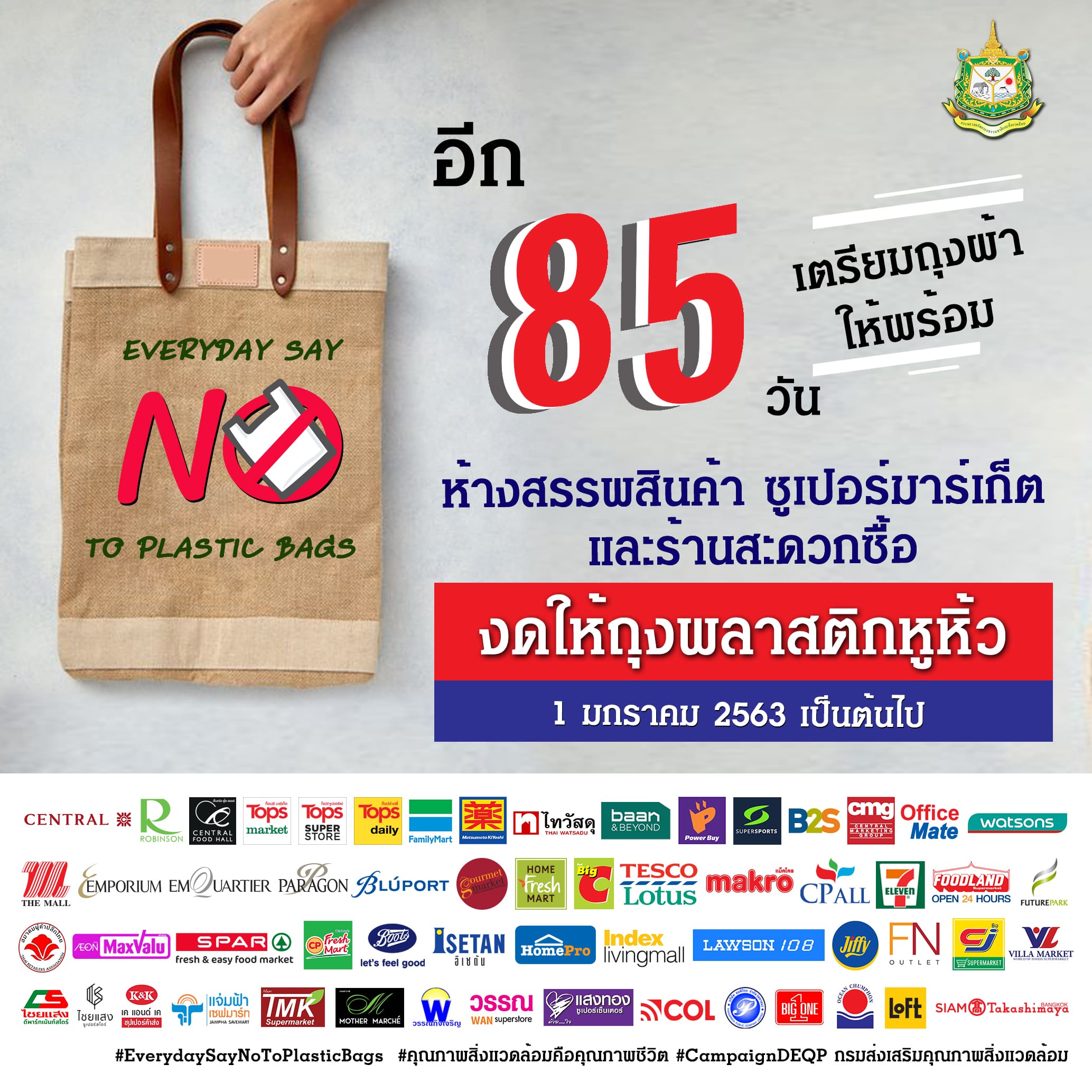 อีก 85 วัน เตรียมถุงผ้าให้พร้อม ห้างสรรพสินค้า ซูเปอร์มาร์เก็ต และร้านสะดวกซื้อ งดให้ถุงพลาสติกหูหิ้ว