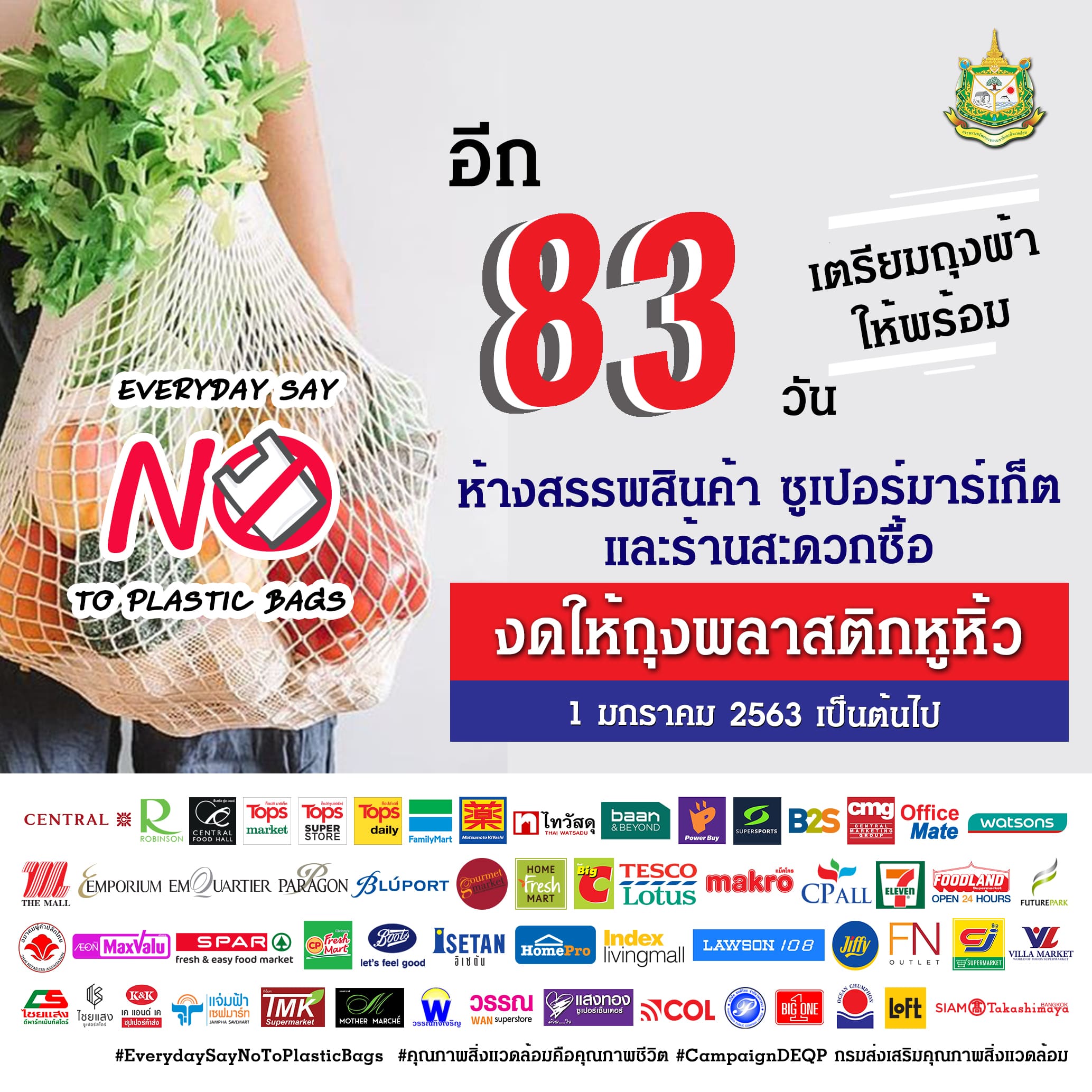 อีก 83 วัน เตรียมถุงผ้าให้พร้อม ห้างสรรพสินค้า ซูเปอร์มาร์เก็ต และร้านสะดวกซื้อ งดให้ถุงพลาสติกหูหิ้ว