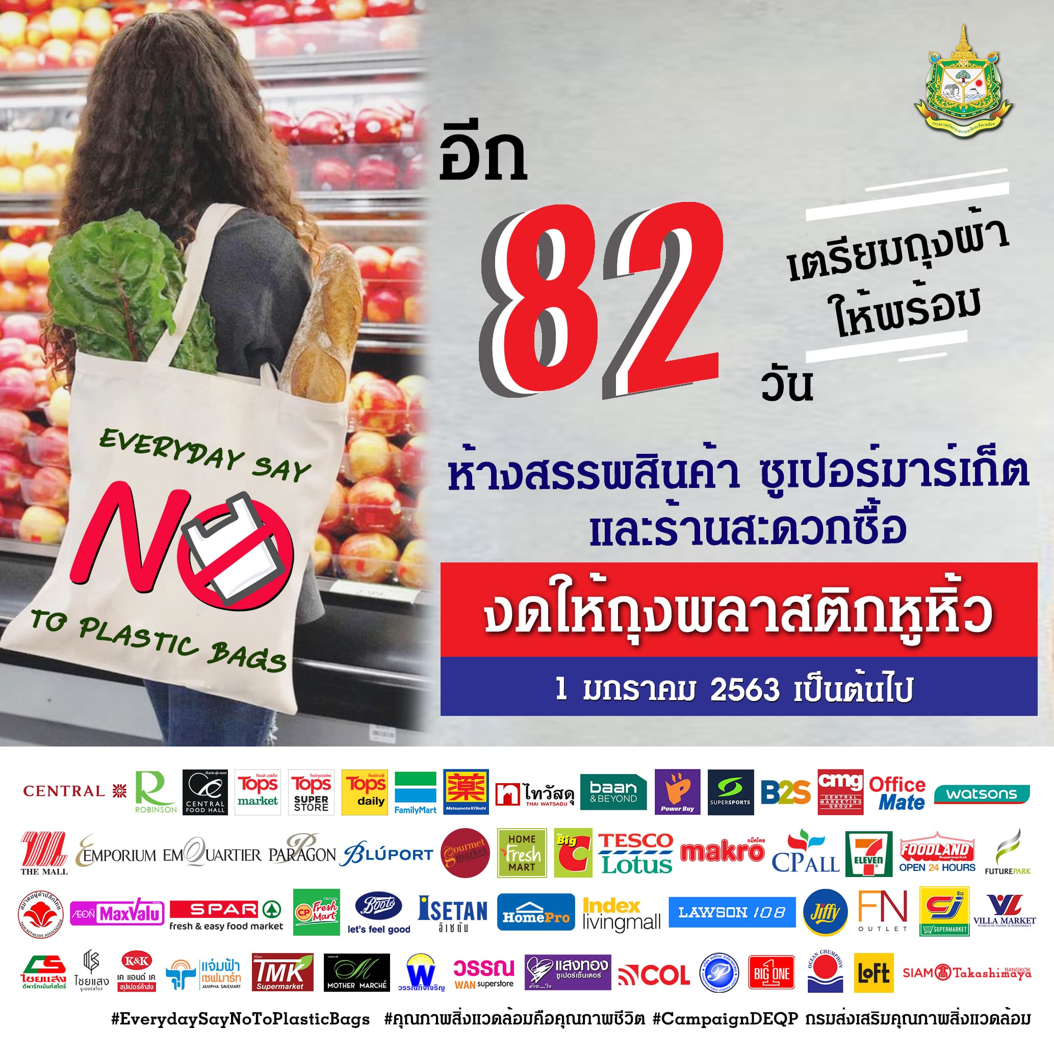 อีก 82 วัน เตรียมถุงผ้าให้พร้อม ห้างสรรพสินค้า ซูเปอร์มาร์เก็ต และร้านสะดวกซื้อ งดให้ถุงพลาสติกหูหิ้ว