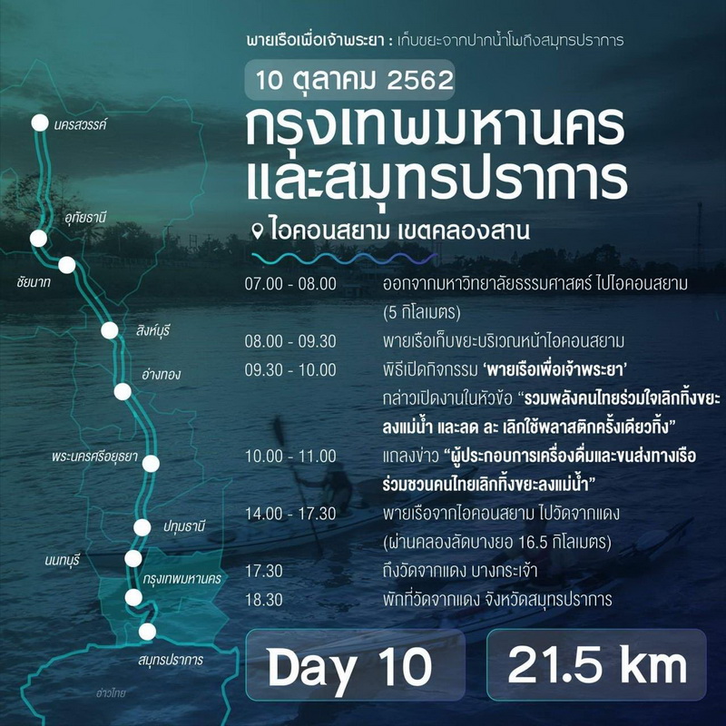 โดยวันที่ 10 ตุลาคม เป็นการพายเรือจากมหาวิทยาลัยธรรมศาสตร์ ท่าพระจันทร์ ตั้งแต่เวลา 07.00 น. เพื่อร่วมพิธีเปิด ณ ไอคอนสยาม จากนั้นพายเรือเก็บขยะตลอดเส้นทางจากไอคอนสยามไปสิ้นสุดที่วัดจากแดง บางกระเจ้า จ.สมุทรปราการ รวมระยะทาง 21.5 กิโลเมตร