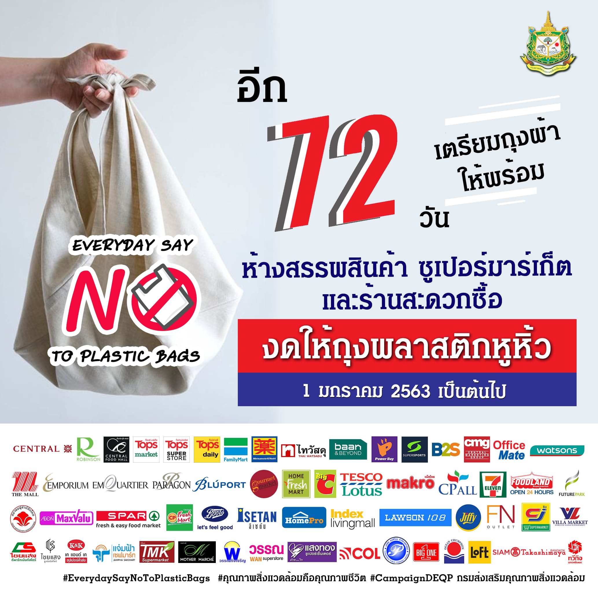 อีก 72 วัน เตรียมถุงผ้าให้พร้อม ห้างสรรพสินค้า ซูเปอร์มาร์เก็ต และร้านสะดวกซื้อ งดให้ถุงพลาสติกหูหิ้ว