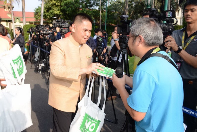 วันที่ 6 พ.ย.2562 ที่ทำเนียบรัฐบาล ก่อนการประชุมคณะรัฐมนตรี (ครม.) นายวราวุธ ศิลปอาชา รัฐมนตรีว่าการกระทรวงทรัพยากรธรรมชาติและสิ่งแวดล้อม (ทส) พร้อมด้วย นายรัชฎา สุริยกุล ณ อยุธยา อธิบดีกรมส่งเสริมคุณภาพสิ่งแวดล้อม (สส.) นำทีมผู้บริหารห้างสรรพสินค้า ศูนย์การค้า และร้านสะดวกซื้อ รณรงค์