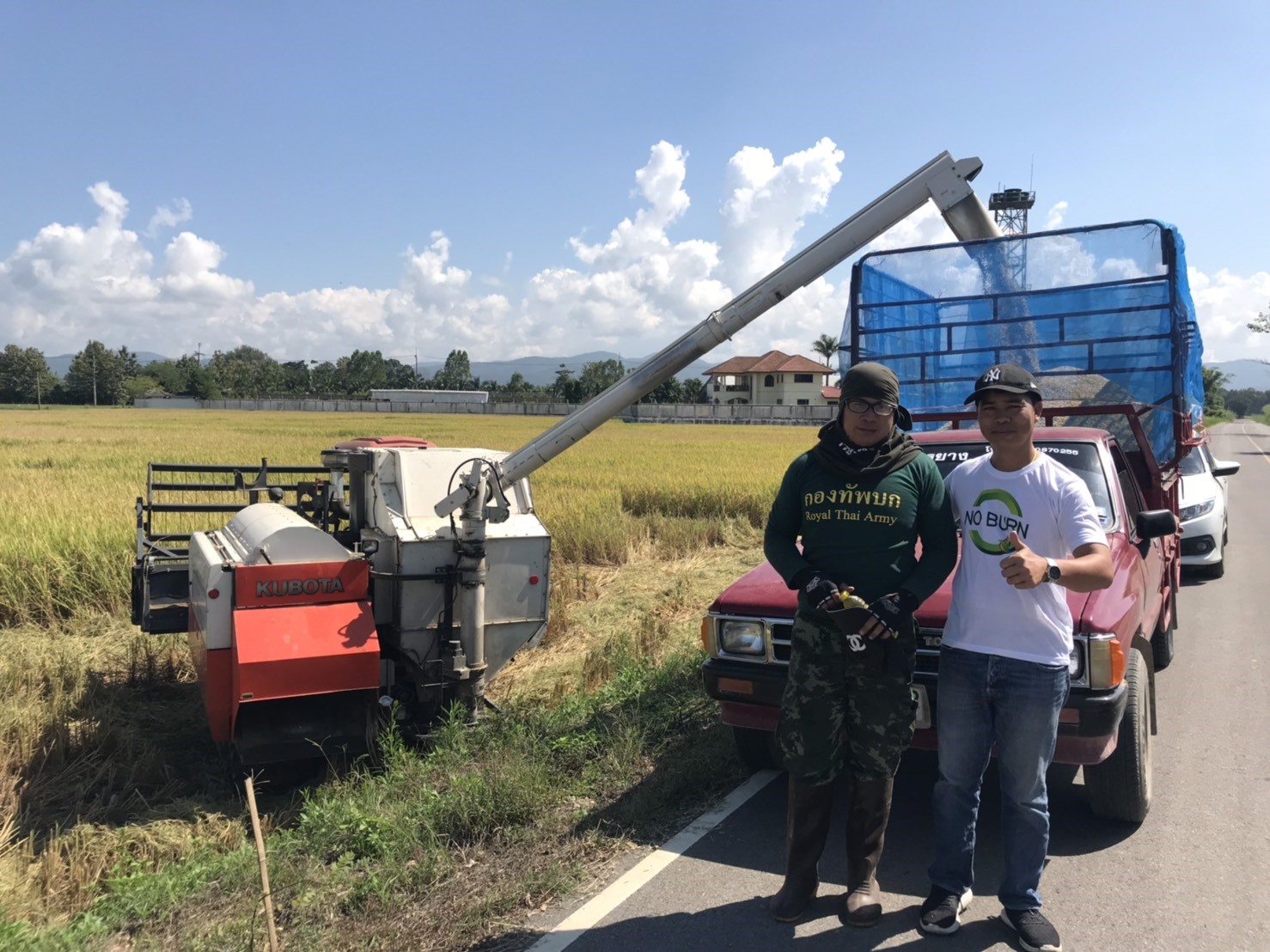 การให้บริการรถเกี่ยวข้าวแก่เกษตรกรที่เข้าร่วมเป็นสมาชิกโครงการลดการเผาและลดใช้สารเคมีในพื้นที่การเกษตร ในพื้นที่ อ.แม่ริม จ.เชียงใหม่ ในราคาถูก เพื่อเป็นส่วนหนึ่งในการช่วยลดค่าใช้จ่ายของเกษตรกร อันเป็นความร่วมมือของมูลนิธิฯ และกองการสัตว์และเกษตรกรรมที่ 3 กรมการสัตว์ทหารบก