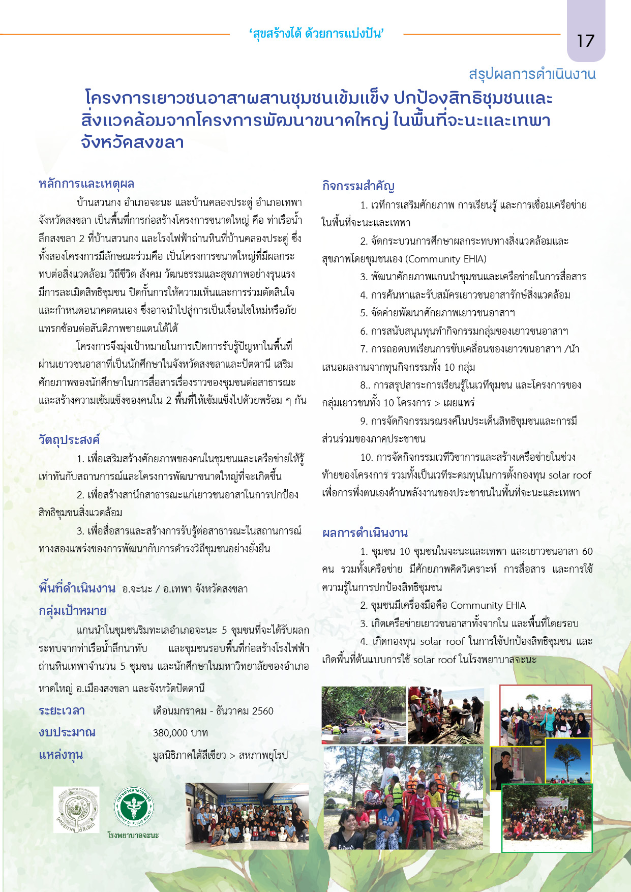 โครงการเยาวชนอาสาผสานชุมชนเข้มแข็ง ปกป้องสิทธิชุมชนและสิ่งแวดล้อมจากโครงการพัฒนาขนาดใหญ่ ในพื้นที่จะนะและเทพา จังหวัดสงขลา วัตถุประสงค์ 1. เพื่อเสริมสร้างศักยภาพของคนในชุมชนและเครือข่ายให้รู้เท่าทันกับสถานการณ์และโครงการพัฒนาขนาดใหญ่ที่จะเกิดขึ้น 2. เพื่อสร้างสานึกสาธารณะแก่เยาวชนอาสาในการปกป้องสิทธิชุมชนสิ่งแวดล้อม 3. เพื่อสื่อสารและสร้างการรับรู้ต่อสาธารณะในสถานการณ์ทางสองแพร่งของการพัฒนากับการดำรงวิถีชุมชนอย่างยั่งยืน ผลการดำเนินงาน 1. ชุมชน 10 ชุมชนในจะนะและเทพา และเยาวชนอาสา 60 คน รวมทั้งเครือข่าย มีศักยภาพคิดวิเคราะห์ การสื่อสาร และการใช้ความรู้ในการปกป้องสิทธิชุมชน 2. ชุมชนมีเครื่องมือคือ Community EHIA 3. เกิดเครือข่ายเยาวชนอาสาทั้งจากใน และพื้นที่โดยรอบ 4. เกิดกองทุน solar roof ในการใช้ปกป้องสิทธิชุมชน และเกิดพื้นที่ต้นแบบการใช้ solar roof ในโรงพยาบาลจะนะ