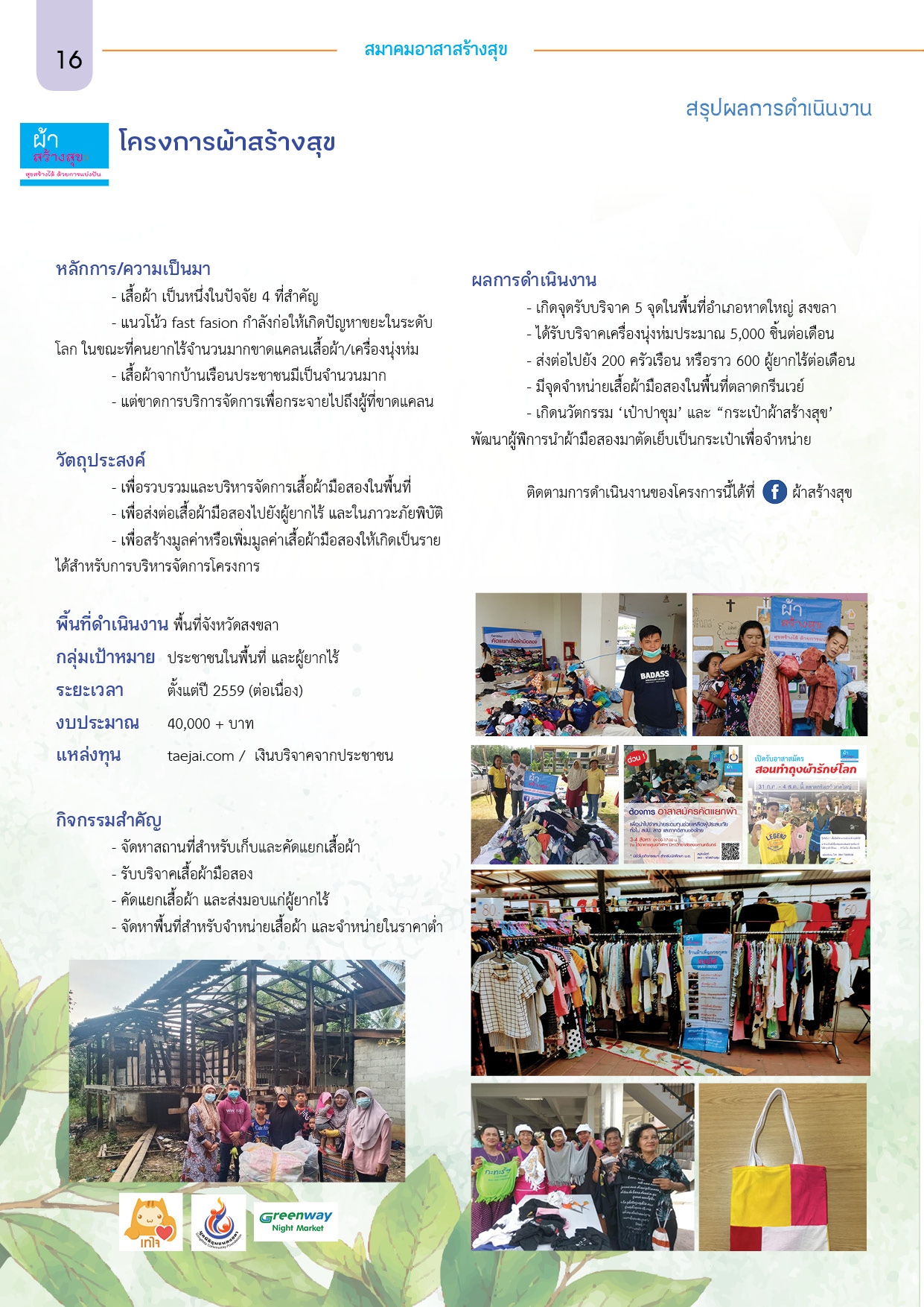 โครงการผ้าสร้างสุข - เพื่อรวบรวมและบริหารจัดการเสื้อผ้ามือสองในพื้นที่ - เพื่อส่งต่อเสื้อผ้ามือสองไปยังผู้ยากไร้ และในภาวะภัยพิบัติ - เพื่อสร้างมูลค่าหรือเพิ่มมูลค่าเสื้อผ้ามือสองให้เกิดเป็นรายได้สำหรับการบริหารจัดการโครงการ