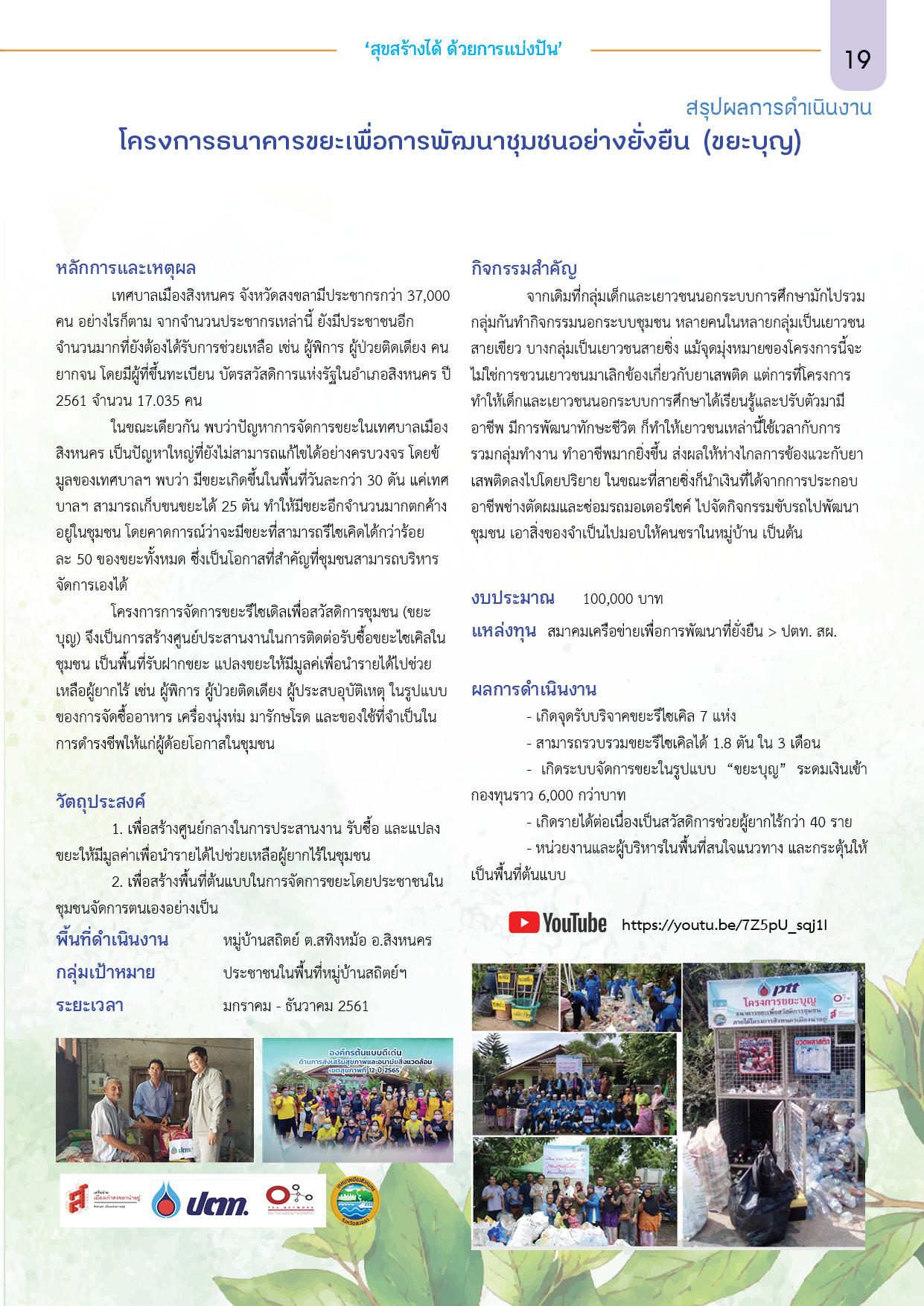 โครงการธนาคารขยะเพื่อการพัฒนาชุมชนอย่างยั่งยืน (ขยะบุญ) โครงการการจัดการขยะรึไซเดิลเพื่อสวัสดิการชุมชน (ขยะบุญ) จึงเป็นการสร้างศูนย์ประสานงานในการติดต่อรับซื้อขยะไซเคิลในชุมชน เป็นพื้นที่รับฝากขยะ แปลงขยะให้มีมูลค่เพื่อนำรายได้ไปช่วยเหลือผู้ยากไร้ เช่น ผู้พิการ ผู้ป่วยติดเดียง ผู้ประสบอุบัติเหตุ ในรูปแบบของการจัดซื้ออาหาร เครื่องนุ่งห่ม มารักษโรด และของใช้ที่จำเป็นในการดำรงชีพให้แก่ผู้ด้อยโอกาสในชุมชน ผลการดำเนินงาน - เกิดจุดรับบริจาคขยะรีไซเคิล 7 แห่ง - สามารถรวบรวมขยะรีไซเคิลได้ 1.8 ตัน ใน 3 เดือน - เกิดระบบจัดการขยะในรูปแบบ “ขยะบุญ” ระดมเงินเข้ากองทุนราว 6,000 กว่าบาท - เกิดรายได้ต่อเนื่องเป็นสวัสดิการช่วยผู้ยากไร้กว่า 40 ราย - หน่วยงานและผู้บริหารในพื้นที่สนใจแนวทาง และกระตุ้นให้เป็นพื้นที่ต้นแบบ