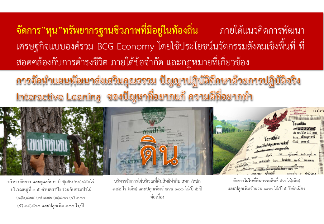 จัดการทุน "สิ่งแวดล้อม " จากทรัพยากรฐานชีวภาพที่มีอยู่ในท้องถิ่น ภายใต้ข้อจำกัดเชิงพื้นที่อย่างถูกต้อง ทั่วถึง เป็นธรรม เพื่อรองรับการเปลี่ยนแปลงของสภาพภูมิอากาศ