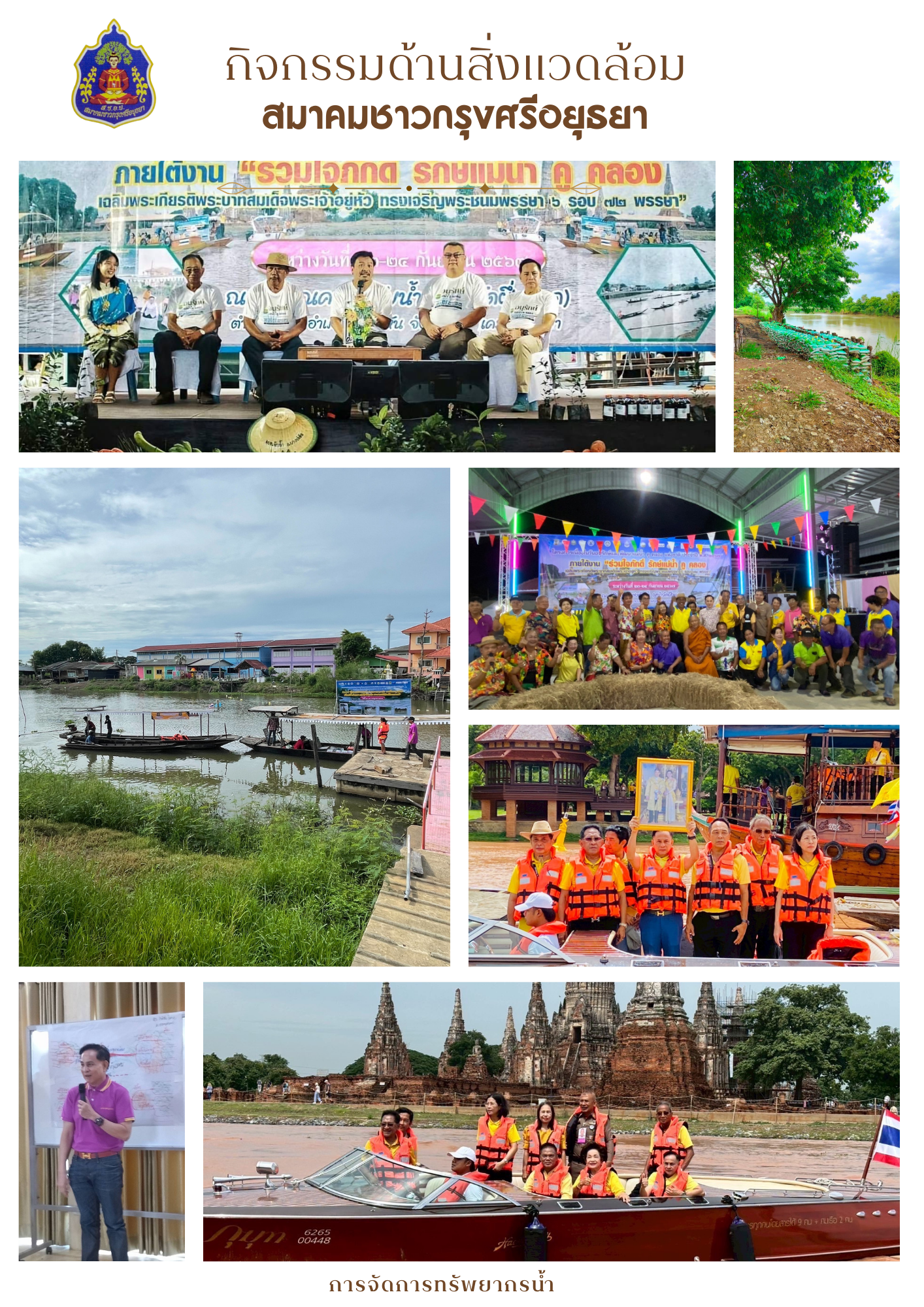 สมาคมชาวกรุงศรีอยุธยามุ่งเน้น กิจกรรมเพื่อจัดการทรัพยากรน้ำและคลอง อย่างชัดเจน โดยมีการจัดกิจกรรม "ร่วมเจตนา รักษ์แม่น้ำ รักษ์คลอง" เพื่อส่งเสริมการอนุรักษ์แหล่งน้ำและสร้างความตระหนักรู้ในหมู่สมาชิกและประชาชน
