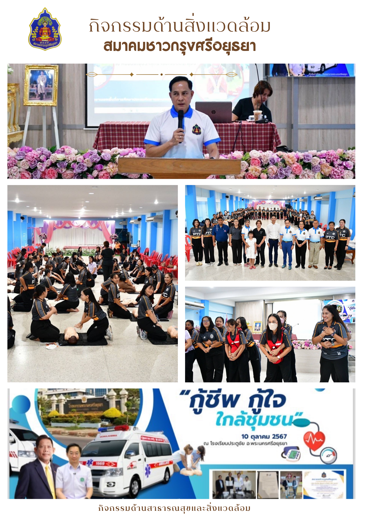 สมาคมชาวกรุงศรีอยุธยาร่วมจัดกิจกรรมที่มุ่งเน้นด้านสาธารณสุขและสิ่งแวดล้อมเป็นหลัก โดยมีกิจกรรม "กู้ชีพ กู้ใจ ใกล้ชุมชน" ที่แสดงให้เห็นถึงการฝึกอบรมการปฐมพยาบาลเบื้องต้นและการช่วยชีวิต (CPR) ให้กับสมาชิกและผู้เข้าร่วม ซึ่งมีเป้าหมายเพื่อเสริมสร้างความรู้และทักษะด้านการแพทย์ฉุกเฉินในชุมชน นอกจากนี้ยังมีภาพการบรรยายบนเวที และการรวมตัวของกลุ่มคนในสถานที่ต่างๆ ที่น่าจะเป็นส่วนหนึ่งของการฝึกอบรมและการสร้างเครือข่ายความร่วมมือในกิจกรรมของสมาคม