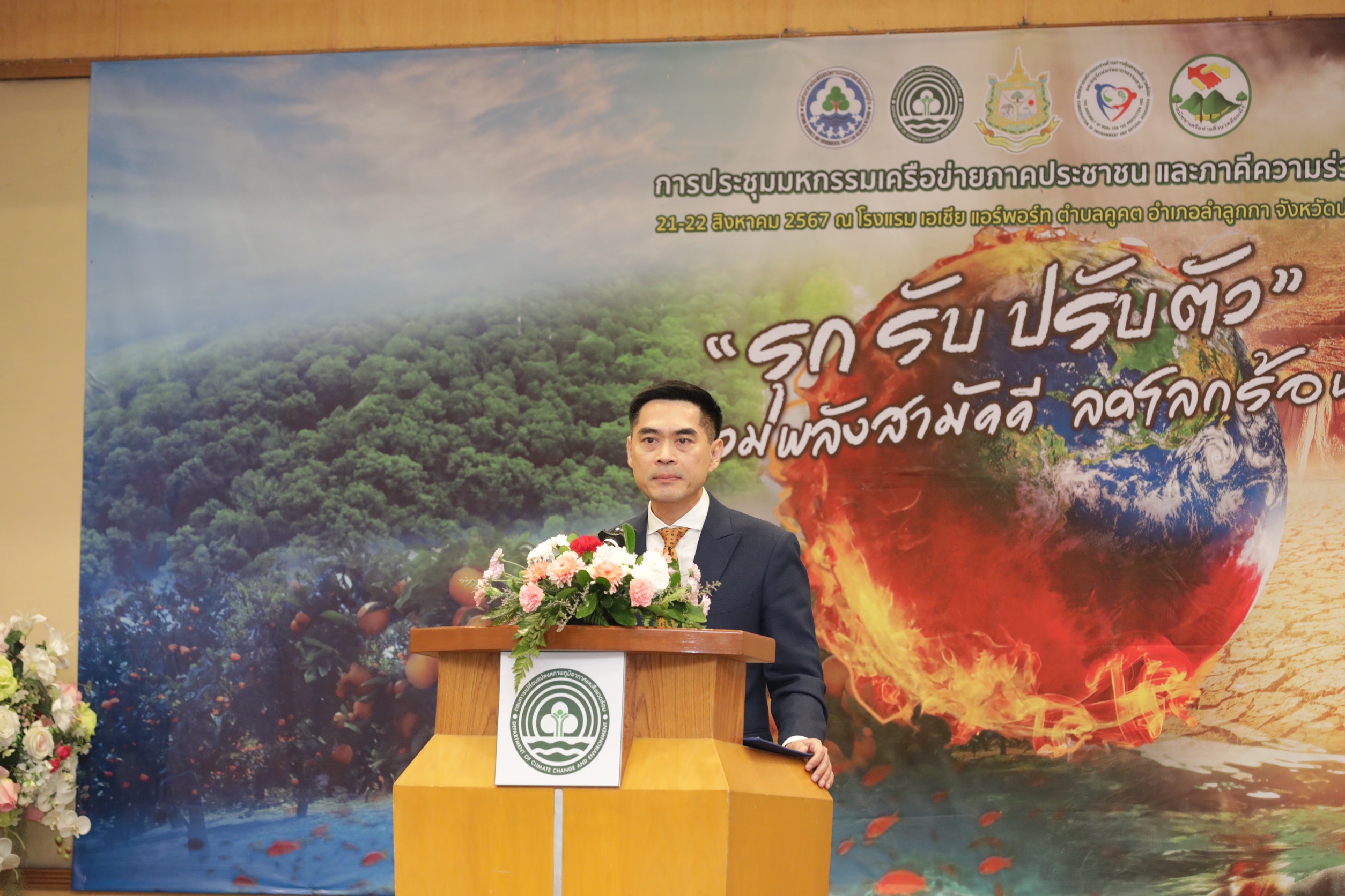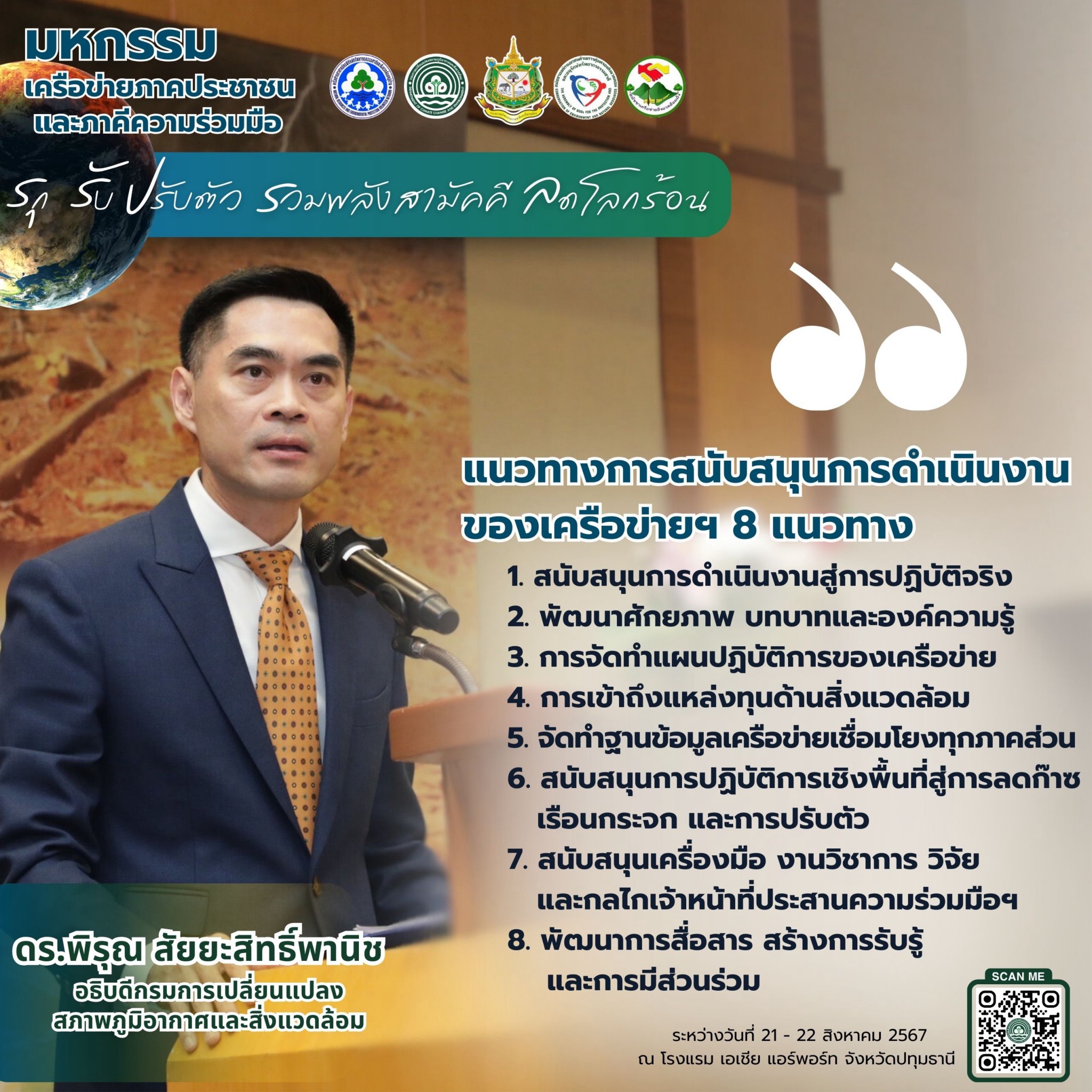 ดร.พิรุณ สัยยะสิทธิ์พานิช อธิบดีกรมการเปลี่ยนแปลงสภาพภูมิอากาศและสิ่งแวดล้อม กล่าวว่า ปัญหาโลกร้อนได้ส่งผลกระทบกับทุกคน ทุกเพศ ทุกวัย ทุกอาชีพและทุกระบบนิเวศ ซึ่งการแก้ไขปัญหานั้นต้องอาศัยความร่วมมือจากทุกภาคส่วน โดยเครือข่ายที่มาในวันนี้เป็นภาคีสำคัญที่ร่วมขับเคลื่อนการทำงานที่มีความสอดคล้องกับแผนการปรับตัวต่อการเปลี่ยนแปลงสภาพภูมิอากาศ แต่ความท้าทายที่จะต้องยกระดับการจัดการให้ทันต่อสถานการณ์ใหม่ มีแผนปฏิบัติการที่ชัดเจนสอดคล้องกับสภาพภูมิสังคมและความรุนแรงของผลกระทบจากการเปลี่ยนแปลงสภาพภูมิอากาศ รวมถึงขยายผลการทำงานในมิติใหม่ ให้พื้นที่อื่นได้ร่วมเรียนรู้และนำไปสู่การปฏิบัติได้ ดังนั้น เพื่อให้เครือข่ายภาคประชาชนและภาคีความร่วมมือ สามารถดำเนินงานให้สอดคล้องกับสถานการณ์ปัจจุบันได้อย่างมีประสิทธิภาพ กระทรวงทรัพยากรธรรมชาติและสิ่งแวดล้อม โดยกรมลดโลกร้อน ได้กำหนดแนวทางการสนับสนุนการดำเนินงาน 8 แนวทาง ได้แก่ 1. สนับสนุนการดำเนินงานของเครือข่ายภาคประชาชนในการขับเคลื่อนแนวทางการจัดการโลกร้อนในเชิงนโยบายไปสู่การปฏิบัติที่สอดคล้องกับความเป็นจริงของแต่ละพื้นที่ 2. พัฒนาศักยภาพ บทบาทและเสริมองค์ความรู้เครือข่ายภาคประชาชน และเยาวชนคนรุ่นใหม่ให้พร้อมรับมือการเปลี่ยนแปลงสภาพภูมิอากาศ 3. สนับสนุนการจัดทำแผนปฏิบัติการที่สอดคล้องกับประเด็นการปรับตัวและสามารถดำเนินงานได้ทั้งในระดับพื้นที่และระดับประเทศ 4. สนับสนุนการเข้าถึงแหล่งทุนทั้งเงินกองทุนสิ่งแวดล้อมและกองทุนที่ได้รับการสนับสนุนจากต่างประเทศ 5. จัดทำฐานข้อมูลเครือข่ายให้มีความเชื่อมโยงกันกับเครือข่ายของหน่วยงานอื่นและองค์กรที่ร่วมทำงาน 6. สนับสนุนปฏิบัติการในเชิงพื้นที่ในประเด็นที่จะนำไปสู่การลดก๊าซเรือนกระจก และการปรับตัวต่อการเปลี่ยนแปลงสภาพภูมิอากาศ เพื่อเสริมความเข็มแข็งในการทำงานของเครือข่ายภาคประชาชน และสามารถขยายผลสู่การเรียนรู้ร่วมกันของเครือข่ายทางสังคม 7. สนับสนุนเครื่องมือ งานวิชาการ งานวิจัย และกลไกเจ้าหน้าที่ประสานความร่วมมือและพัฒนาเครือข่ายประจำจังหวัด ซึ่งปัจจุบันมีจำนวน 47 คนใน 47 จังหวัด และจะขยายให้ครบทุกจังหวัดในอนาคต และ 8. พัฒนาการสื่อสาร สร้างการรับรู้และการมีส่วนร่วมในการแก้ไขปัญหาผลกระทบจากโลกร้อน พร้อมทั้งสร้างคุณค่าการทำงานผ่านสิ่งต่าง ๆ ที่จะถูกถ่ายทอดลงไปสู่ประชาชนในระดับพื้นที่ ได้อย่างเต็มที่และมีประสิทธิภาพมากที่สุด”