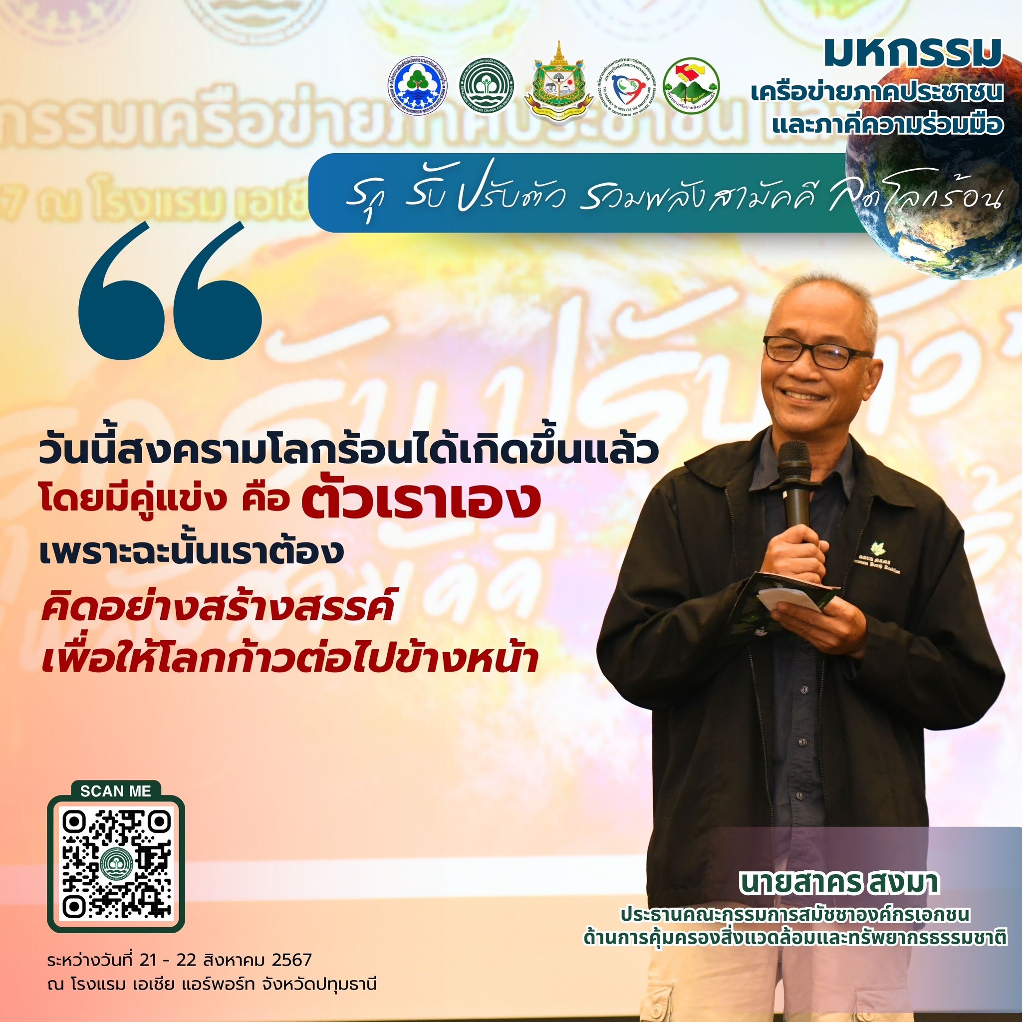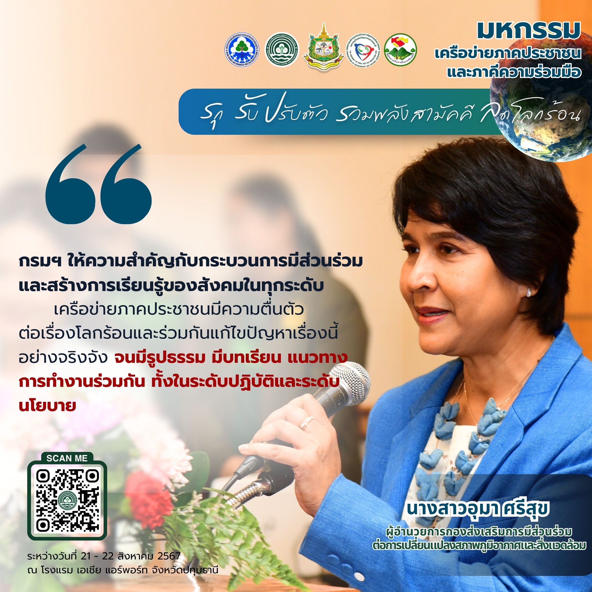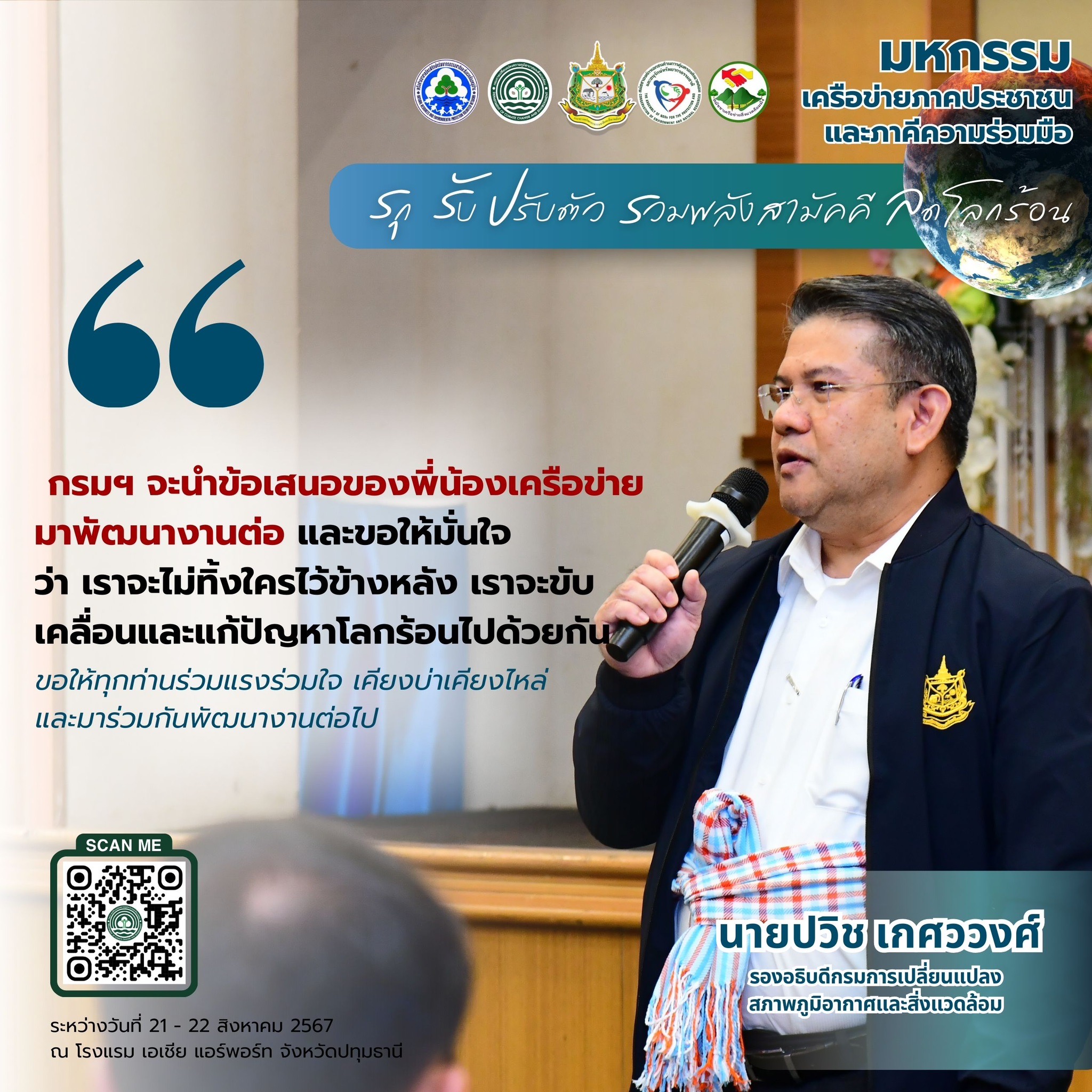 “ปัญหาโลกร้อนมีความรุนแรงมากขึ้นและเป็นเรื่องที่รอไม่ได้ จึงจำเป็นอย่างยิ่งที่จะต้องได้รับความร่วมมือจากทุกภาคส่วน นำไปสู่การเสริมพลังการทำงานซึ่งกันและกัน ขับเคลื่อนการแก้ไขปัญหาโดยนำต้นทุนที่มีอยู่ มาต่อยอด พัฒนาเพื่อแก้ “วิกฤตการเปลี่ยนแปลงสภาพภูมิอากาศ”