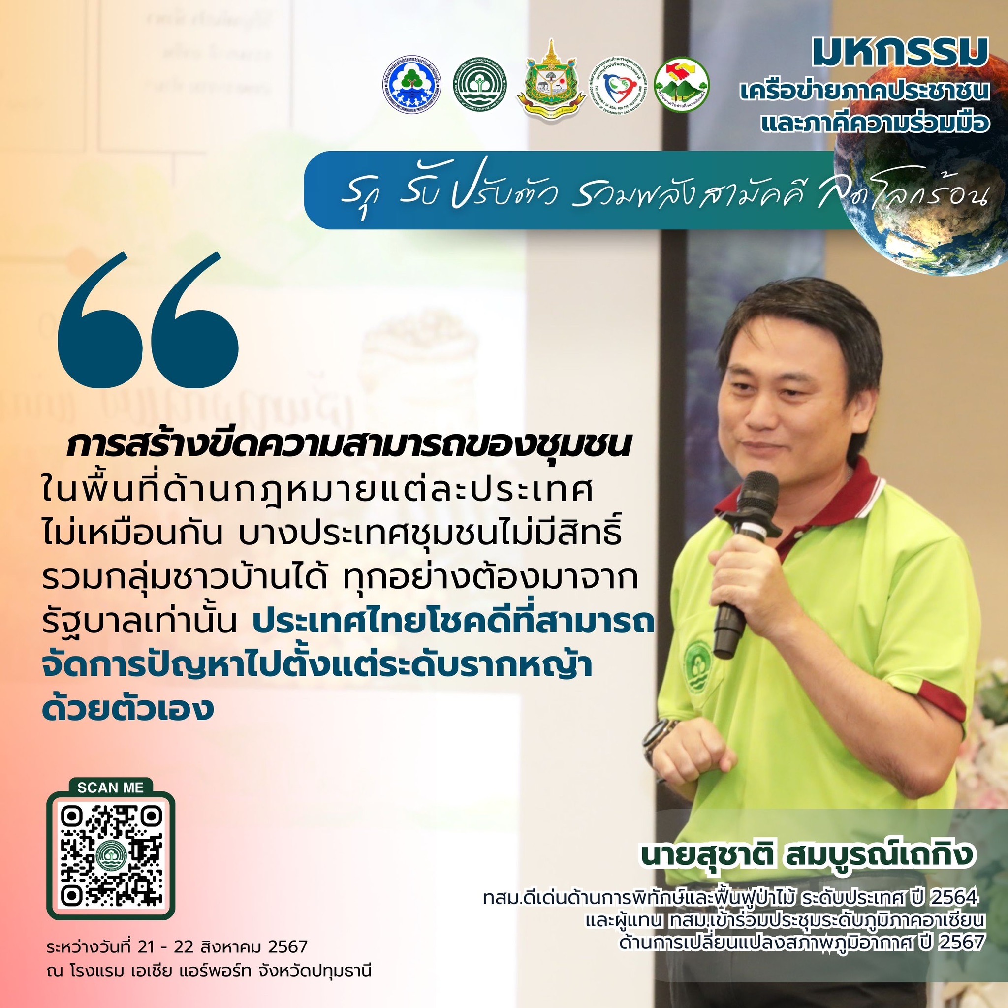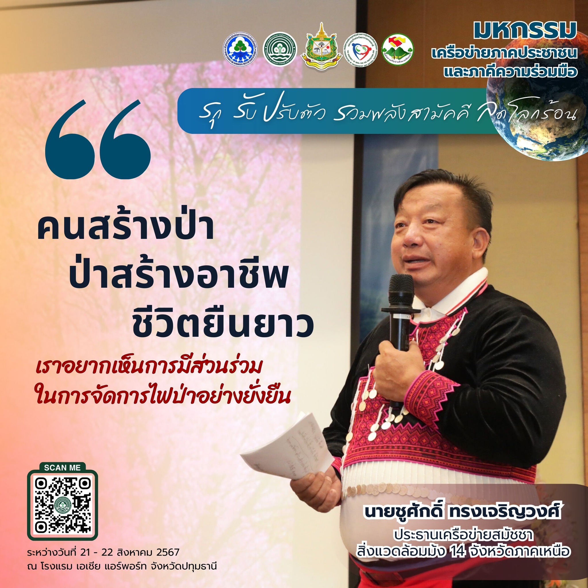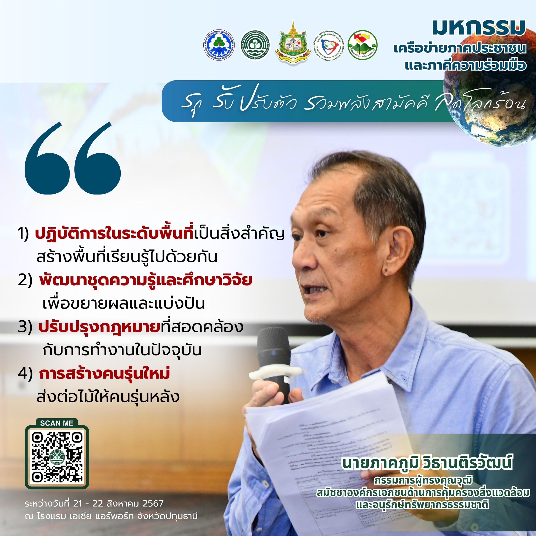 “ปัญหาโลกร้อนมีความรุนแรงมากขึ้นและเป็นเรื่องที่รอไม่ได้ จึงจำเป็นอย่างยิ่งที่จะต้องได้รับความร่วมมือจากทุกภาคส่วน นำไปสู่การเสริมพลังการทำงานซึ่งกันและกัน ขับเคลื่อนการแก้ไขปัญหาโดยนำต้นทุนที่มีอยู่ มาต่อยอด พัฒนาเพื่อแก้ “วิกฤตการเปลี่ยนแปลงสภาพภูมิอากาศ”