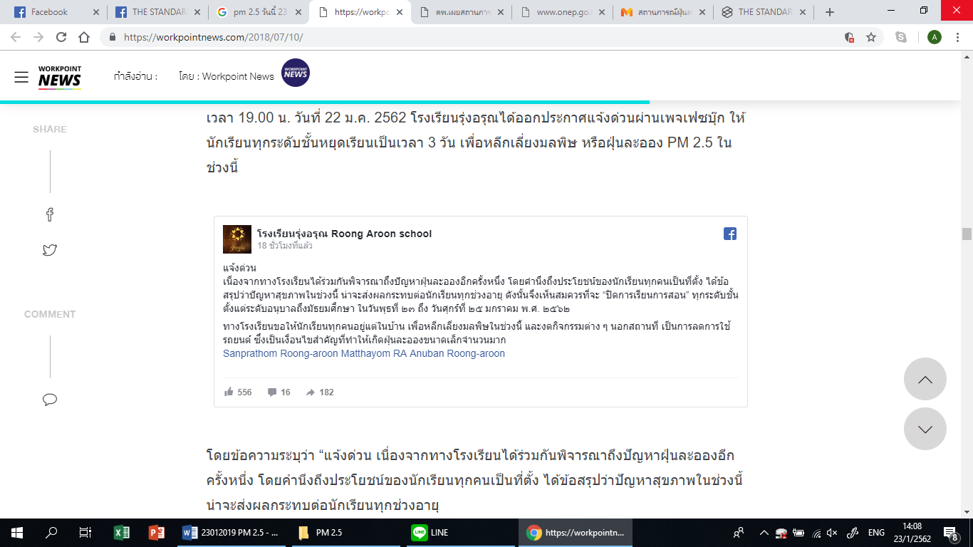 เวลา 19.00 น. วันที่ 22 ม.ค. 2562 โรงเรียนรุ่งอรุณได้ออกประกาศแจ้งด่วนผ่านเพจเฟซบุ๊ก ให้นักเรียนทุกระดับชั้นหยุดเรียนเป็นเวลา 3 วัน เพื่อหลีกเลี่ยงมลพิษ หรือฝุ่นละออง PM 2.5 ในช่วงนี้