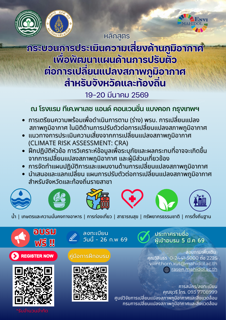 | ชื่อหลักสูตร : | กระบวนการประเมินความเสี่ยงด้านภูมิอากาศเพื่อพัฒนาแผนด้านการปรับตัวต่อการเปลี่ยนแปลงสภาพภูมิอากาศสำหรับจังหวัดและท้องถิ่น (ขอสงวนสิทธิ์พิจารณารับผู้ที่ปฏิบัติงานที่เกี่ยวข้องกับหลักสูตรนี้) |
